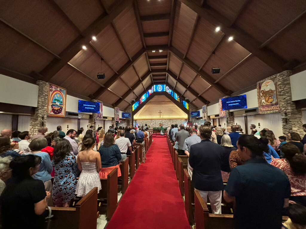 The Processional Hymn is drawn from the Hymnal. While standing, the congregation sings the hymn while the acolytes, lay ministers and readers, and clergy enter the sanctuary. The lyrics for the hymn are available on the screen or in the hymnal.